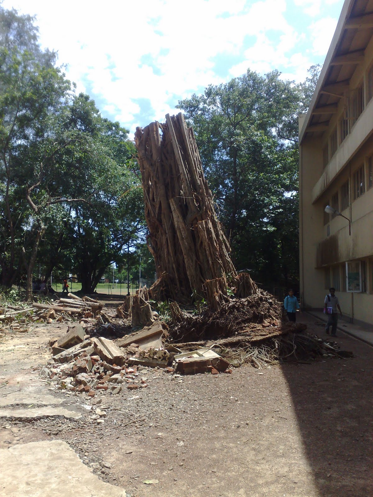 மரத்தை வெட்டிஅகற்றும் பணியும் ஆரம்பமாகியது. மேல்பாகங்களை மட்டும் வெட்டி அகற்றிவிட்டு கீழே உள்ள பெரிய தண்டுப்பாகத்தை அப்படியே மீண்டும் நிமிர்த்தி வைத்துவிட்டார்கள். திரும்பி வளர்வதற்காக(????????).